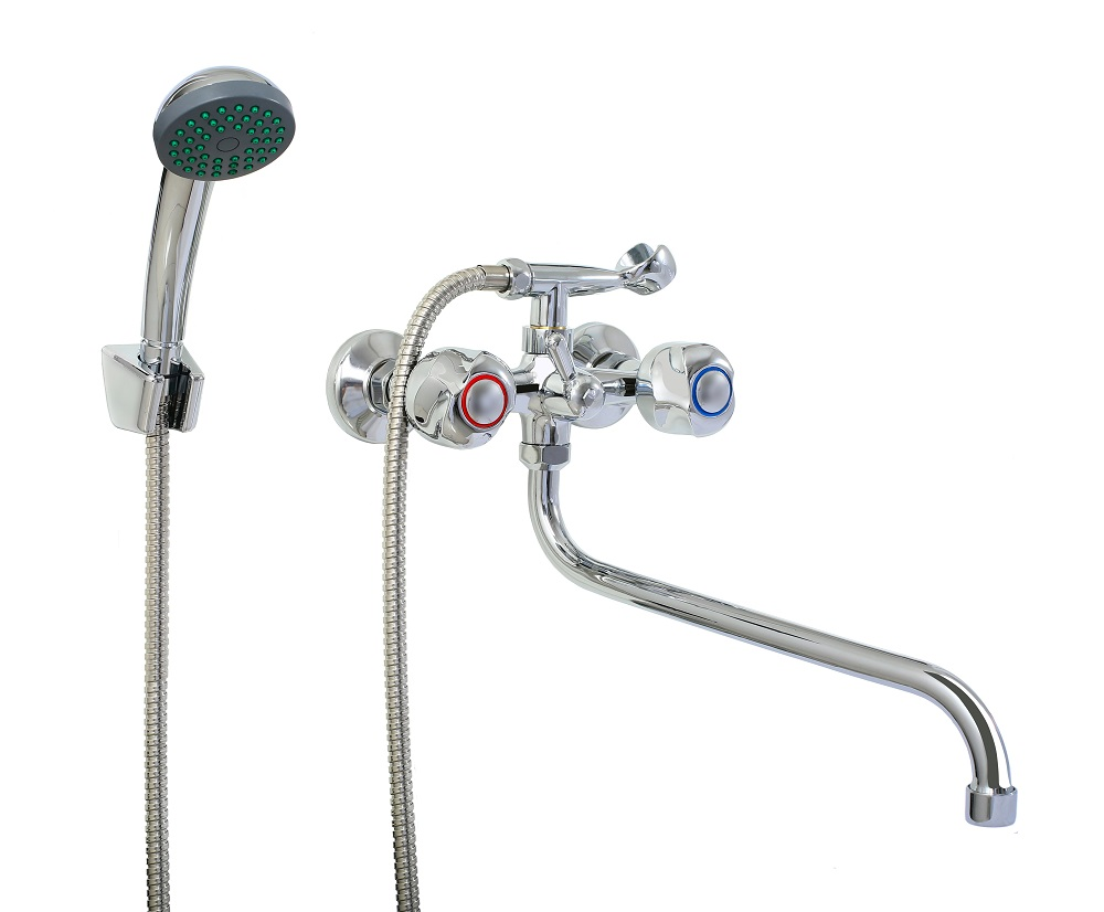 - Смеситель предназначен для ванной комнаты, сочетает в себе наличие низкого поворотного излива и душевой лейки, что делает его общим.